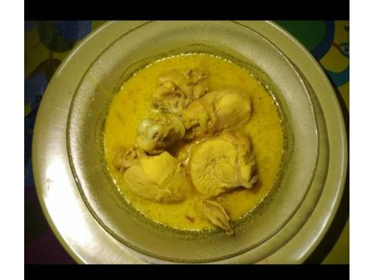 Ayam ungkep dgn bumbu marinasi, digoreng dan di gulai dgn bumbu kuning diracik sendiri.