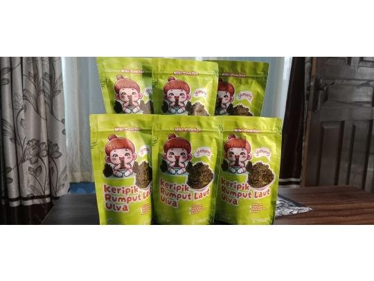 Keripik Rumput Laut jenis Rumput Laut Ulva Lactuca yang yang diolah menjadi makanan ringan dengan varian rasa.